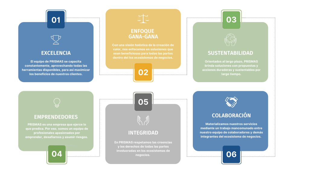 ⚖️ Enfoque gana-gana: En PRISMAS tenemos una visión holística de la creación de valor. Por eso, nos enfocamos en soluciones que sean beneficiosas para los distintos integrantes de los ecosistemas de negocios y no para una sola parte en detrimento de otra.