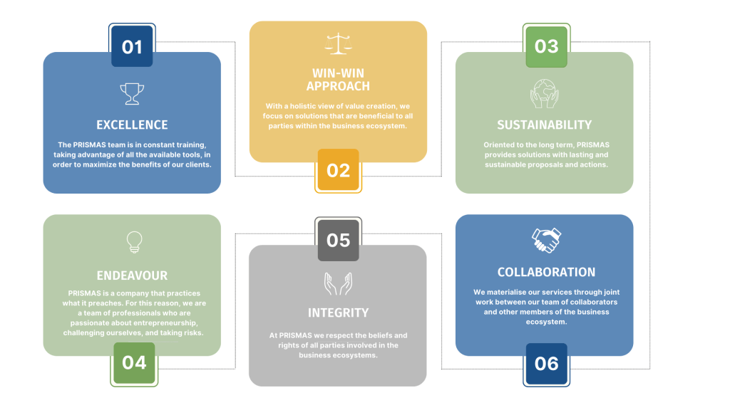 ♻️ Sustainability: PRISMAS is a long-term oriented firm. This means that its actions, the relationship with its stakeholders, and the recommendations to our customers are being analysed beyond the usual short-term periods. This implies respect to future generations.